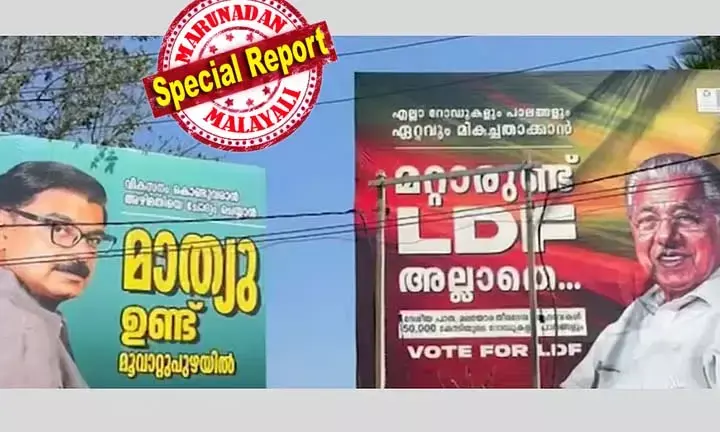 പിണറായിയുടെ ചിരിക്കുന്ന മുഖവുമായി 'മറ്റാരുണ്ട് എല്ഡിഎഫ് അല്ലാതെ' എന്ന പരസ്യവാചകവുമായി ഇടതു മുന്നണിയുടെ ഫ്ലക്സ് ബോര്ഡ്; 'വികസനം കൊണ്ടുവരാന്, അഴിമതിയെ ചോദ്യം ചെയ്യാന് മാത്യു ഉണ്ട് മൂവാറ്റുപുഴയില്' എന്ന മറുപടി പോസ്റ്ററുമായി യുഡിഎഫ്; ഉന്നക്കുപ്പയില് ഫ്ലക്സ് പോര്
