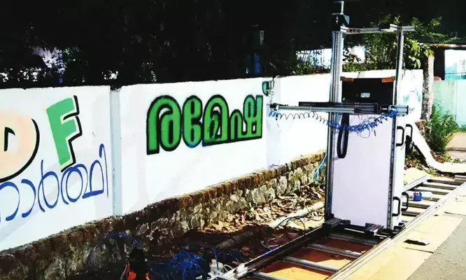 തെരഞ്ഞെടുപ്പ് അടുത്തു, ചുമരെഴുതാന് ആളെ കിട്ടാനില്ലെ! ബ്രഷും പെയിന്റും ഒക്കെ ഇനി പഴങ്കഥ! ചുമരുകളില് വിസ്മയം തീര്ക്കാന് യന്ത്രക്കൈകള്! വെറും 15 മിനിറ്റില് സ്ഥാനാര്ത്ഥിയുടെ പേരും ചിത്രവും ചിഹ്നവും ഒക്കെ റെഡി! പാലക്കാട് രമേഷ് പിഷാരടിയുടെ പടം വരച്ച് ഞെട്ടിച്ച് 'ചുവര്ബോട്ട്'; തിരഞ്ഞെടുപ്പ് സീസണ് തൂക്കാന് പാലക്കാട്ടെ ഈ സ്റ്റാര്ട്ടപ്പ് കമ്പനി