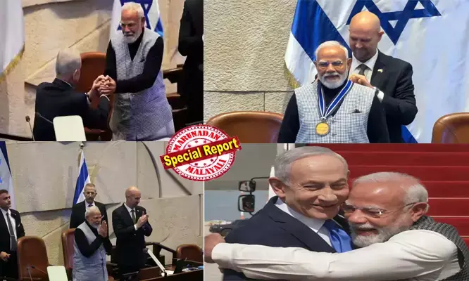 ഇസ്രയേല് പാര്ലമെന്റില് എത്തിയ പ്രധാനമന്ത്രി മോദിക്ക് അംഗങ്ങള് എഴുന്നേറ്റുനിന്ന് ആദരവ് പ്രകടിപ്പിച്ചു. നെസെറ്റ് സ്പീക്കര് അമീര് ഓഹാന, മോദിയെ ഇസ്രയേലിന്റെ ഉറച്ച സഖ്യകക്ഷിയെന്നും ഇന്ത്യയെ മാറ്റിമറിച്ച നേതാവെന്നും പ്രശംസിച്ചു. നെതന്യാഹുവിന്റെ പ്രസംഗത്തിനിടെ, സുപ്രീം കോടതി പ്രസിഡന്റിനെ ക്ഷണിക്കാത്തതില് പ്രതിഷേധിച്ച് പ്രതിപക്ഷ എംപിമാര് സഭ ബഹിഷ്കരിച്ചിരുന്നു. എന്നാല് ഇന്ത്യയോടുള്ള ബഹുമാനസൂചകമായി മോദിയുടെ പ്രസംഗം കേള്ക്കാന് അവര് പിന്നീട് തിരിച്ചെത്തി. സ്പീക്കര് ഓഫ് ദി നെസറ്റ് മെഡല് നല്കി മോദിയെ ആദരിച്ചു. ഈ പുരസ്കാരം നേടുന്ന ആദ്യ വിദേശനേതാവാണ് മോദി.