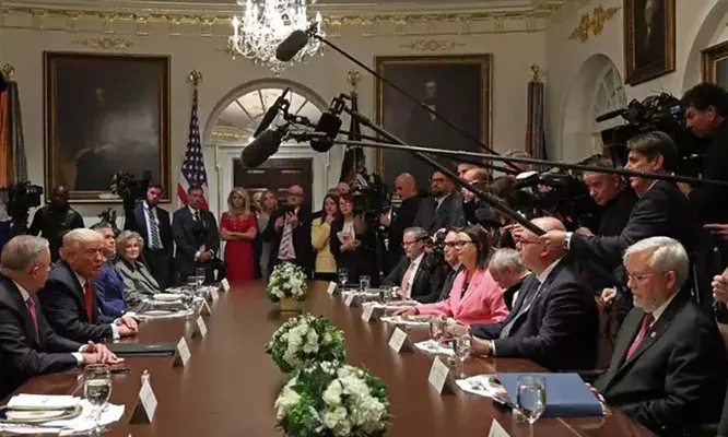''ഞാനിത് നിലവറയില് നിന്ന് ഇപ്പോഴാണ് ഇങ്ങോട്ട് മാറ്റിയത്. തുടര്ന്ന് ആദ്യം സംഭവിച്ചത് അതില് ക്യാമറ തട്ടി എന്നതാണ്. വിശ്വസിക്കാന് പ്രയാസമാണല്ലേ. പക്ഷേ ജീവിതത്തിലെ ചില പ്രശ്നങ്ങള് ഇങ്ങനെയാണ്'', ട്രംപ് പറഞ്ഞതിനു പിന്നാലെ മുറിയിലാകെ ചിരി പടര്ന്നു.