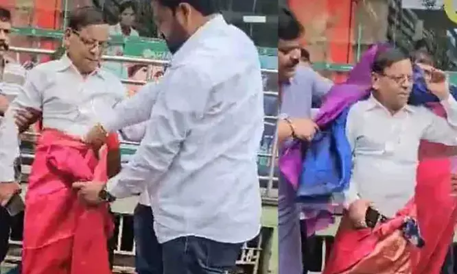 കല്യാൺ: പ്രധാനമന്ത്രി നരേന്ദ്ര മോദിയുടെ സാരിയുടുത്ത തരത്തിൽ മോർഫ് ചെയ്ത ചിത്രം സാമൂഹിക മാധ്യമങ്ങളിൽ പങ്കുവെച്ച കോൺഗ്രസ് നേതാവിനെ സാരിയുടുപ്പിച്ച് ബിജെപി പ്രവർത്തകർ. മഹാരാഷ്ട്രയിലെ ഡോംബിവ്ലിയിലാണ് സംഭവം നടന്നത്. പ്രധാനമന്ത്രിയെ അപമാനിച്ചതിൽ പ്രതിഷേധിച്ച് ബിജെപി പ്രവർത്തകർ കോൺഗ്രസ് നേതാവ് പ്രകാശ് 'മാമ' പഗാരെയെ പരസ്യമായി സാരിയുടുപ്പിക്കുകയായിരുന്നു.