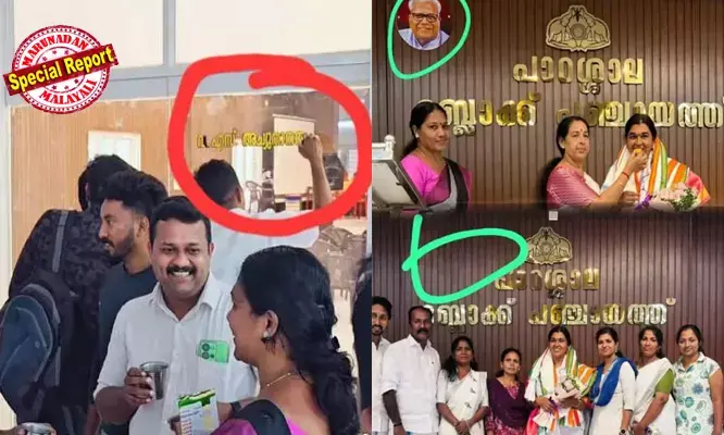 അതേസമയം, ചിത്രം മാറ്റിയോ എന്നറിയില്ലെന്നും വിഷയം പരിശോധിക്കാമെന്നുമാണ് ബ്ലോക്ക് പഞ്ചായത്ത് പ്രസിഡന്റ് എസ്. ഉഷാ കുമാരിയുടെ പ്രതികരണം.