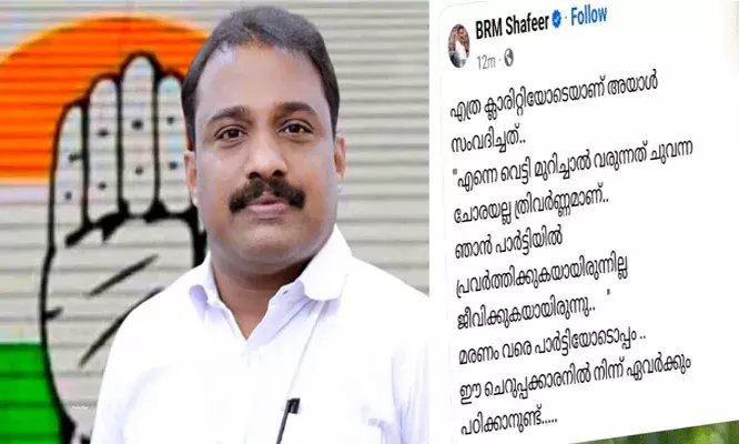 അബിന് വര്ക്കി വാര്ത്താ സമ്മേളനത്തില് നടത്തിയ പരാമര്ശങ്ങള് ഉള്ക്കൊള്ളിച്ചായിരുന്നു ബി.ആര്.എം. ഷെഫീറിന്റെ ഫേസ്ബുക്ക് പോസ്റ്റ്. 'എത്ര ക്ലാരിറ്റിയോടെയാണ് അയാള് സംവദിച്ചത്' എന്ന് തുടങ്ങിയ കുറിപ്പില്, 'എന്നെ വെട്ടി മുറിച്ചാല് വരുന്നത് ചുവന്ന ചോരയല്ല, ത്രിവര്ണ്ണമാണ്. ഞാന് പാര്ട്ടിയില് പ്രവര്ത്തിക്കുകയായിരുന്നില്ല, ജീവിക്കുകയായിരുന്നു. മരണം വരെ പാര്ട്ടിയോടൊപ്പം' എന്ന അബിന്റെ വാക്കുകള് ഉദ്ധരിച്ചിരുന്നു. ഈ ചെറുപ്പക്കാരനില് നിന്ന് ഏവര്ക്കും പഠിക്കാനുണ്ട് എന്നും ഷെഫീര് കുറിച്ചു. എന്നാല്, പോസ്റ്റ് ചെയ്തതിന് നിമിഷങ്ങള്ക്കകം തന്നെ ഈ കുറിപ്പ് പിന്വലിക്കുകയായിരുന്നു.