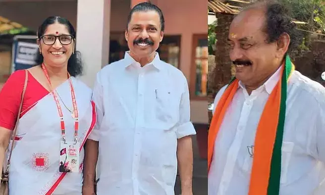 കോഴിക്കോട് നോര്ത്ത് മണ്ഡലം എന്ഡിഎ സ്ഥാനാര്ത്ഥി നവ്യാ ഹരിദാസിന്റെ തെരഞ്ഞെടുപ്പ് കമ്മിറ്റി ഓഫീസ് എരഞ്ഞിപ്പാലത്ത് ഉദ്ഘാടനം ചെയ്യുകയായിരുന്നു സി കെ പത്മനാഭന്. 'കെട്ട്യോളാണ് എന്റെ മാലാഖ' എന്നു പറയേണ്ട ഗതികേടിലാണ് സിപിഎം സംസ്ഥാന സെക്രട്ടറി എം വി ഗോവിന്ദന്. സിപിഎമ്മിന്റെ കുത്തകസീറ്റായ തളിപ്പറമ്പില് സ്വന്തം ഭാര്യയെത്തന്നെ മത്സരിപ്പിക്കണമെന്നത് എം വി ഗോവിന്ദന്റെ സ്വാര്ത്ഥ താത്പര്യമാണെന്നും പത്മനാഭന് പറഞ്ഞു.