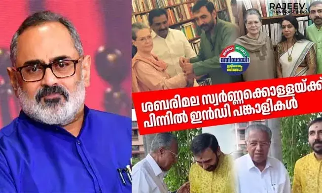 ശബരിമല സ്വര്ണക്കൊള്ളയുടെ തുടക്കം കോണ്ഗ്രസ് ഭരണകാലത്ത്; 'ഇന്ഡ്യ' സഖ്യ ശൃംഖലയിലെ കൂടുതല് വമ്പന്മാര്ക്ക് സ്വര്ണക്കൊള്ളയില് വ്യക്തമായ പങ്കുണ്ട്; സോണിയയ്ക്കൊപ്പമുള്ള പോറ്റിയുടെ ചിത്രങ്ങള് തെളിവ്; ആരോപണവുമായി രാജീവ് ചന്ദ്രശേഖര്