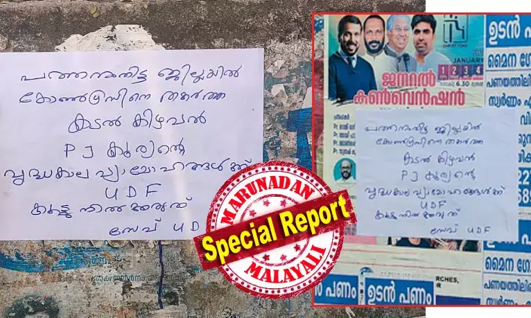 കടല്കിഴവന് കുര്യന്റെ വാര്ധക്യകാല വ്യാമോഹങ്ങള്ക്ക് യുഡിഎഫ് കൂട്ടു നില്ക്കരുത്; തിരുവല്ല നഗരത്തില് മുതിര്ന്ന കോണ്ഗ്രസ് നേതാവ് പിജെ കുര്യനെതിരേ പോസ്റ്ററുകള്: പോസ്റ്റര് വന്നത് തിരുവല്ലയില് കുര്യന് മത്സരിക്കുമെന്ന അഭ്യൂഹം പടരുന്നതിനിടെ