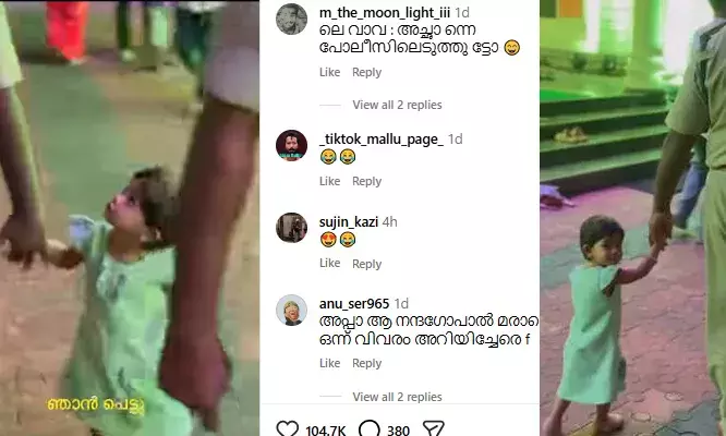 ലെ വാവ : എന്നാ അച്ഛാ ഞാന് പോയേച്ചും വരാം, അച്ഛന് സ്റ്റേഷനില് എത്തിയാല് മതി...പള്ളി മുറ്റത്ത് വച്ചു പോലീസ്ക്കാര് ഈ കുട്ടിയോട് ചെയ്തത് കണ്ടാല് നിങ്ങള് ഞെട്ടും...അച്ഛന് : നിന്നെ ഞങ്ങള് എവിടെ ഒക്കെ അന്വേഷിച്ചു ... നീ എവിടെയായിരുന്നു. കൊച്ച് : പോലീസ് സ്റ്റേഷനില് നോക്കിയിലല്ലൊ..ഞാന് അവിടെയായിരുന്നു. (പുലിവാല് കല്യാണം സലിംകുമാര് dialogue ) ഇങ്ങനെയെല്ലാമാണ് മറ്റ് കമന്റുകള് 'ലെ വാവ: അച്ഛാ എന്നെ പൊലീസിലെടുത്തു ട്ടോ', ' ലെ മോള്: ഞാന് കേസ് ഉണ്ടാകാറുണ്ട് പക്ഷെ ആദ്യം ആയിട്ട് ആണ് പൊലീസ് സ്റ്റേഷന് കേറുന്നേ' - ഇങ്ങനെ പോകുന്നു കമന്റുകള്.