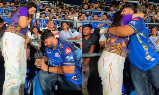 കൊല്ക്കത്ത നൈറ്റ് റൈഡേഴ്സ് സുന്ദരിക്ക് മുന്നില് മുട്ടുകുത്തി മുംബൈ ഇന്ത്യന്സ് പയ്യന്; പ്രണയാഭ്യര്ത്ഥനയ്ക്കിടെ വന് ട്വിസ്റ്റ്! മോതിരം സീറ്റിനിടയില് വീണതോടെ തിരച്ചിലോട് തിരച്ചില്; വാംഖഡെയുടെ നെഞ്ചിടിപ്പേറ്റിയ നിമിഷം; പിന്നാലെ കയ്യടി; 'മുംബൈ നൈറ്റ് റൈഡേഴ്സ്' എന്ന് നെറ്റിസണ്സ്