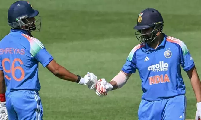 എന്നാൽ, പിന്നീട് ക്രീസിലെത്തിയ രോഹിത് ശർമയും ശ്രേയസ് അയ്യരും ചേർന്ന് ഇന്ത്യൻ ഇന്നിംഗ്സിന് കരുത്തേകി. ആദ്യ പത്തോവറിൽ 19 റൺസെടുത്ത രോഹിത്, പിന്നീട് വേഗത കൂട്ടി. 74 പന്തിൽ രോഹിത് അർധസെഞ്ചുറിയിലെത്തി. മികച്ച പിന്തുണയുമായി ശ്രേയസ് അയ്യരും ഒപ്പം ചേർന്നതോടെ ഇന്ത്യ 24-ാം ഓവറിൽ 100 റൺസ് പിന്നിട്ടു. 67 പന്തിൽ അർധസെഞ്ചുറി നേടിയ ശ്രേയസ്, രോഹിത്തിനൊപ്പം മൂന്നാം വിക്കറ്റിൽ 136 പന്തിൽ 118 റൺസ് കൂട്ടിചേർത്ത് ഇന്ത്യയെ തിരിച്ചുവരവിന് സഹായിച്ചു.
