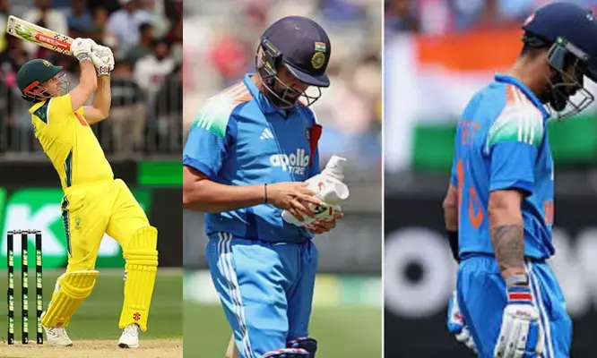 ടോസ് നഷ്ടത്തിന് പിന്നാലെ ക്രീസിലിറങ്ങിയ ഇന്ത്യക്ക് മിച്ചല് സ്റ്റാര്ക്ക് എറിഞ്ഞ മൂന്നാം ഓവറിലെ നാലാം പന്ത് സ്ട്രൈറ്റ് ഡ്രൈവിലൂടെ ബൗണ്ടറി കടത്തി രോഹിത് പ്രതീക്ഷ നല്കി. എന്നാല് തൊട്ടടുത്ത ഓവറില് ഹേസല്വുഡിന്റെ എക്സ്ട്രാ ബൗണ്സ് രോഹിത്തിനെ ചതിച്ചു. ഓഫ് സ്റ്റംപ് ലൈനില് കുത്തി ഉയര്ന്ന പന്തില് ബാറ്റുവെച്ച രോഹിത്തിനെ (8) സ്ലിപ്പില് മാറ്റ് റെന്ഷാ കൈയിലൊതുക്കി. പിന്നാലെ കിംഗ് കോലി ക്രീസിലെത്തി. ഹേസല്വുഡിന്റെ നേരിട്ട ആദ്യ പന്തില് തന്നെ എല് ബി ഡബ്ല്യു അപ്പീല് അതിജീവിച്ചെങ്കിലും നേരിട്ട ആദ്യ ഏഴ് പന്തിലും കോലിക്ക് അക്കൗണ്ട് തുറക്കാനായില്ല. ഒടുവില് നേരിട്ട എട്ടാം പന്തില് മിച്ചല് സ്റ്റാര്ക്കിനെതിരെ ഫ്ലാഷി ഡ്രൈവിന് ശ്രമിച്ച കോലിയെ പോയന്റില് കൂപ്പര് കൊണോളി പറന്നു പിടിച്ചു. ഓസ്ട്രേലിയയില് കഴിഞ്ഞ 30 ഏകദിന ഇന്നിംഗ്സുകളില് കോലിയുടെ ആദ്യ ഡക്കാണിത്.
