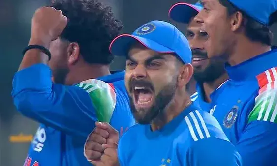 ടോസ് നഷ്ടപ്പെട്ട് ബാറ്റിങ്ങിനിറങ്ങിയ ഇന്ത്യക്ക് തുടക്കത്തില് തന്നെ 16 പന്തില് 18 റണ്സെടുത്ത ഓപണര് യശസ്വി ജയ്സ്വാളിനെ നഷ്ടമായി. നാന്ദ്രെ ബര്ഗറിനായിരുന്നു വിക്കറ്റ്. രണ്ടാം വിക്കറ്റില് കോലിയും രോഹിത്തും ഇന്ത്യയെ മുന്നോട്ടു നയിച്ചു. തുടക്കത്തില് ശ്രദ്ധയോ?ടെ കളിച്ച കോഹ്ലി പിന്നീട് അരങ്ങുവാഴുകയായിരുന്നു. ബപത്ത് ഓവര് അവസാനിക്കുമ്പോള് ഒരു വിക്കറ്റിന് 80 റണ്സെന്ന നിലയിലായിരുന്ന ഇന്ത്യ അടുത്ത പത്ത് ഓവറില് രോകോ സഖ്യം ടീമിനെ 153 ലെത്തിച്ചു.