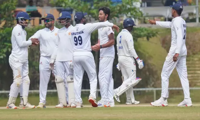 കര്ണാടകക്കായി മൊഹ്സിന് ഖാന് വെറും 6 വിക്കറ്റുകള് വീഴ്ത്തി കേരളത്തിന്റെ ബാറ്റിംഗ് നിരയെ തകര്ത്തെറിഞ്ഞു. വിദ്യുത് കവേരപ്പ രണ്ട് വിക്കറ്റുകള് വീഴ്ത്തി. നാലാം ദിനം വിക്കറ്റ് നഷ്ടമില്ലാതെ 10 റണ്സെന്ന നിലയില് ബാറ്റിംഗ് പുനരാരംഭിച്ച കേരളത്തിന് തുടക്കത്തിലേ വിക്കറ്റുകൾ നഷ്ടമായി. സ്കോര് 19 റണ്സിലെത്തിയപ്പോള് നൈറ്റ് വാച്ച്മാനായി ക്രീസിലെത്തിയ നിധീഷ് എംഡിയെ (9) വിദ്യുത് കവേരപ്പ പുറത്താക്കി. പിന്നാലെ മൂന്നാം നമ്പറിലെത്തിയ അക്ഷയ് ചന്ദ്രനെ നേരിട്ട ആദ്യ പന്തില് പുറത്താക്കി കവേരപ്പ കേരളത്തെ കൂടുതൽ സമ്മർദ്ദത്തിലാക്കി.