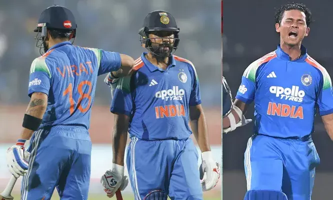 54 പന്തില് രോഹിത് അര്ധസെഞ്ചുറി തികച്ചപ്പോള് 20-ാം ഓവറില് ഇന്ത്യ വിക്കറ്റ് നഷ്ടമില്ലാതെ 100 കടന്നു. പിന്നാലെ കോര്ബിന് ബോഷിന്റെ തുടര്ച്ചയായ ഓവറുകളില് രോഹിത് സിക്സ് പറത്തി. പിന്നാലെ ജയ്സ്വാള് 75 പന്തില് അര്ധസെഞ്ചുറിയിലെത്തി.26ാം ഓവറില് ഇന്ത്യ 150 കടന്നതിന് പിന്നാലെ മഹാരാജിനെ സിക്സിന് പറത്താനുള്ള ശ്രമത്തില് രോഹിത് മടങ്ങി. പിന്നീടെത്തിയ വിരാട് കോലിയും ആക്രമിച്ചു കളിക്കാനാണ് ശ്രമിച്ചത്. കോര്ബിന് ബോഷെറിഞ്ഞ 34-ാം ഓവറില് ഫോറും സിക്സും പറത്തി കോലി തകര്ത്തടിച്ചപ്പോള് അര്ധസെഞ്ചുറിക്ക് ശേഷം ജയ്സ്വാളും ഗിയര് മാറ്റി. 111 പന്തില് ജയ്സ്വാള് കന്നി ഏകദിന സെഞ്ചുറി തികച്ചു. അര്ധസെഞ്ചുറിയില് നിന്ന് സെഞ്ചുറിയിലേക്ക് 36 പന്തുകള് മാത്രമാണ് ജയ്സ്വാള് എടുത്തത്. ഏകദിനത്തിലും സെഞ്ചുറി നേടിയതോടെ മൂന്ന് ഫോര്മാറ്റിലും സെഞ്ചുറി നേടുന്ന ആറാമത്തെ മാത്രം ഇന്ത്യന് താരമായി ജയ്സ്വാള്.