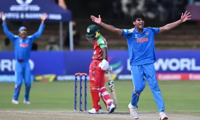 പിന്നാലെ ചിമുഗോരോയുമായി ചേര്ന്ന് ലിറോയ് സ്കോര് നൂറുകടത്തി. ലീറോയ് അര്ധസെഞ്ചുറിയുമായി സിംബാബ്വേയ്ക്ക് പ്രതീക്ഷ സമ്മാനിച്ചു. എന്നാല് 62 റണ്സില് നില്ക്കേ താരത്തെ പുറത്താക്കി ഉദ്ധവ് മോഹന് സിംബാബ് വേയെ കൂടുതല് പ്രതിരോധത്തിലാക്കി. പിന്നീട് വന്നവരെല്ലാം നിരനിരയായി കൂടാരം കയറി. ചിമുഗോരോ 29 റണ്സെടുത്ത് പുറത്തായി. ഒടുക്കം 148 റണ്സിന് സിംബാബ്വേ കൂടാരം കയറി.