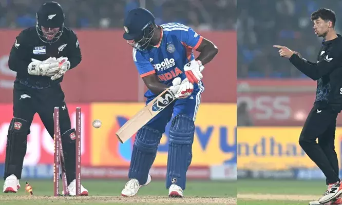 എന്നാല് ഓരോ പന്തിലും ഷോര്ട്ട് ബോള് പ്രതീക്ഷിച്ച് സഞ്ജു ബാറ്റിംഗ് ക്രീസില് പിന്നിലേക്ക് പോകുന്നതിനെ കമന്റേറ്റര്മാര് വിമര്ശിച്ചു. നേരിട്ട ആദ്യ നാലു പന്തില് റണ്ണെടുക്കാന് കഴിയാതിരുന്ന റിങ്കു സിംഗ് അടുപ്പിച്ച് രണ്ട് സിക്സ് പറത്തി സഞ്ജുവിന്റെ സമ്മര്ദ്ദമകറ്റി. ഇഷ് സോധിക്കെതിരെ അഞ്ചാം ഓവറില് ഒരു ബൗണ്ടറി കൂടി നേടിയ സഞ്ജു ജേക്കബ് ഡഫിയെറിഞ്ഞ പവര് പ്ലേയിലെ അവസാന ഓവറില് തകര്പ്പന് സിക്സ് അടിച്ച് പ്രതീക്ഷ നല്കി. എന്നാല് അതിന് അധികം ആയുസുണ്ടായില്ല. പവര് പ്ലേക്ക് പിന്നാലെ പന്തെടുത്ത കീവീസ് ക്യാപ്റ്റന് മിച്ചല് സാന്റ്നറുടെ പന്ത് ബാക്ക് ഫൂട്ടിലിറങ്ങി പ്രതിരോധിക്കാന് ശ്രമിച്ച സഞ്ജു ക്ലീന് ബൗള്ഡായി മടങ്ങി. നല്ല തുടക്കം മുതലാക്കാതെ ഒരിക്കല് കൂടി പുറത്തായതിന്റെ നിരാശ മുഴുവന് സഞ്ജുവിന്റെ മുഖത്തുണ്ടായിരുന്നു.