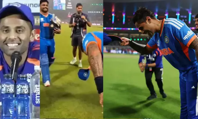 അതേസമയം, സൂപ്പര് 8 റൗണ്ടിന് മുന്പ് സഞ്ജുവിനെ പ്ലേയിങ് ഇലവനിലേക്ക് തിരികെ കൊണ്ടുവരുന്നതിനെക്കുറിച്ച് ഒരു മാധ്യമ പ്രവര്ത്തകന് ചോദിച്ചപ്പോള് സൂര്യ അത് ചിരിച്ചുതള്ളിയത് സൈബര്ലോകത്ത് വീണ്ടും ചര്ച്ചയായി. സൂര്യകുമാര് അന്നു പറഞ്ഞതിന്റെ വിഡിയോയും ഇന്ന് ക്യാപ് ഈരി 'തലകുനി'ക്കുന്നതിന്റെയും വിഡിയോയും ചേര്ത്ത് പലരും പോസ്റ്റ് ചെയ്തു. അഹമ്മദാബാദില് ദക്ഷിണാഫ്രിക്കയ്ക്കെതിരായ ഇന്ത്യയുടെ സൂപ്പര് 8 പോരാട്ടത്തിന് മുന്നോടിയായി നടന്ന വാര്ത്താ സമ്മേളനത്തിലായിരുന്നു ഈ സംഭവം.