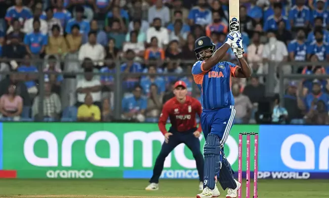 സെമിയില് 42 പന്തില് നിന്ന് 89 റണ്സാണ് സഞ്ജു അടിച്ചുകൂട്ടിയത്. ഇംഗ്ലണ്ട് ക്യാപ്ടന് ഹാരി ബ്രൂക്ക് 15 റണ്സില് സഞ്ജുവിനെ പുറത്താക്കിയിരുന്നെങ്കില് ഇന്ത്യ തിരിച്ചടി നേരിട്ടേനെ. എന്നാല് സഞ്ജുവിന്റെ ക്യാച്ച് ഹാരി ബ്രൂക്ക് വിട്ടുകളഞ്ഞു. സൂപ്പര് 8-ല് വെസ്റ്റ് ഇന്ഡീസിനെതിരെ നേടിയ 97 റണ്സിന്റെ ആത്മവിശ്വാസത്തില് ബാറ്റ് വീശിയ സഞ്ജു, ലോകകപ്പ് നോക്കൗട്ട് ചരിത്രത്തിലെ ഏറ്റവും ഉയര്ന്ന ടീം സ്കോറിലേക്കാണ് ഇന്ത്യയെ എത്തിച്ചത്.