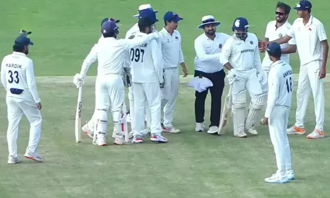 220 പന്തില് 181 റണ്സെടുത്ത ഷാ ഒടുവില് ഇന്ത്യന് താരം സര്ഫറാസ് ഖാന്റെ സഹോദരന് മുഷീര് ഖാന്റെ പന്തിലാണ് പുറത്താകുന്നത്. പുറത്തായതിനു പിന്നാലെ മുഷീറിന്റെ ആഘോഷവും മുംബൈ താരങ്ങളുടെ പരിഹാസവും ഷായെ പ്രകോപിപ്പിക്കുകയായിരുന്നു. വലിയ വാക്കേറ്റവും കയ്യാങ്കളിയുമാണ് പിന്നീട് അരങ്ങേറിയത്. മുന് ടീം അംഗങ്ങളെ ബാറ്റുവീശി അടിക്കാനൊരുങ്ങിയ ഷായെ, സഹ ബാറ്ററാണ് തടഞ്ഞത്. മുഷീറിന്റെ കോളറില് ഷാ പിടിച്ചതായും റിപ്പോര്ട്ടുണ്ട്. അമ്പയര്മാര് ഇടപെട്ട് ഏറെ പണിപ്പെട്ടാണ് തര്ക്കം അവസാനിപ്പിച്ചത്. ഇതിന്റെ ദൃശ്യങ്ങള് സോഷ്യല് മീഡിയയില് വൈറലാണ്.