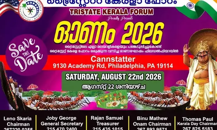 ഫിലാഡല്ഫിയ: ട്രൈസ്റ്റേറ്റ് കേരള ഫോറത്തിന്റെ നേതൃത്വത്തില് ഈ വര്ഷത്തെ ഓണം ആഘോഷം ആഗസ്റ്റ് 22-ാം തീയതി ശനിയാഴ്ച ഫിലഡല്ഫിയയിലെ കാന്സ്റ്റാറ്റര് വോള്ക്സ്ഫെസ്റ്റ് വെറൈന് (Cannstatter), 9130 Academy Road, PA 19114 ഓഡിറ്റോറിയത്തില്നടത്തപ്പെടുമെന്ന് സംഘാടക സമിതി അറിയിച്ചു.