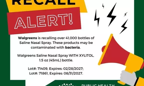 കണ്ടാമിനേഷന് (അണുബാധ) ആശങ്കകളെ തുടര്ന്ന് Walgreens Saline Nasal Spray with Xylitol-ന്റെ 1.5 ഔണ്സ് ബോട്ടിലുകളാണ് തിരിച്ചുവിളിച്ചത്. ഭക്ഷ്യ-മരുന്ന് ഭരണകൂടം (FDA) പറയുന്നതനുസരിച്ച്, ഈ ഉല്പ്പന്നത്തില് Pseudomonas lactis എന്ന ബാക്ടീരിയയുടെ സാന്നിധ്യം ഉണ്ടാകാന് സാധ്യതയുണ്ട്.