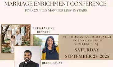സോമര്സെറ്റ്, ന്യൂജേഴ്സി: ഷിക്കാഗോ സെന്റ് തോമസ് സീറോ മലബാര് കത്തോലിക്കാ രൂപതയുടെ ഫാമിലി അപ്പോസ്തലേറ്റ്, 2025 സെപ്റ്റംബര് 27, ശനിയാഴ്ച സോമര്സെറ്റിലെ സെന്റ് തോമസ് സീറോ മലബാര് കാത്തോലിക് ഫൊറോന ദൈവാലയത്തില് (508 Elizabeth Ave, Somerset, NJ 08873) ഒരു ദാമ്പത്യ നവീകരണ ധ്യാനം സംഘടിപ്പിക്കുന്ന വിവരം ഇടവക വികാരി റവ.ഫാ. ജോണിക്കുട്ടി പുലിശ്ശേരി സന്തോഷപൂര്വ്വം അറിയിക്കുന്നു.