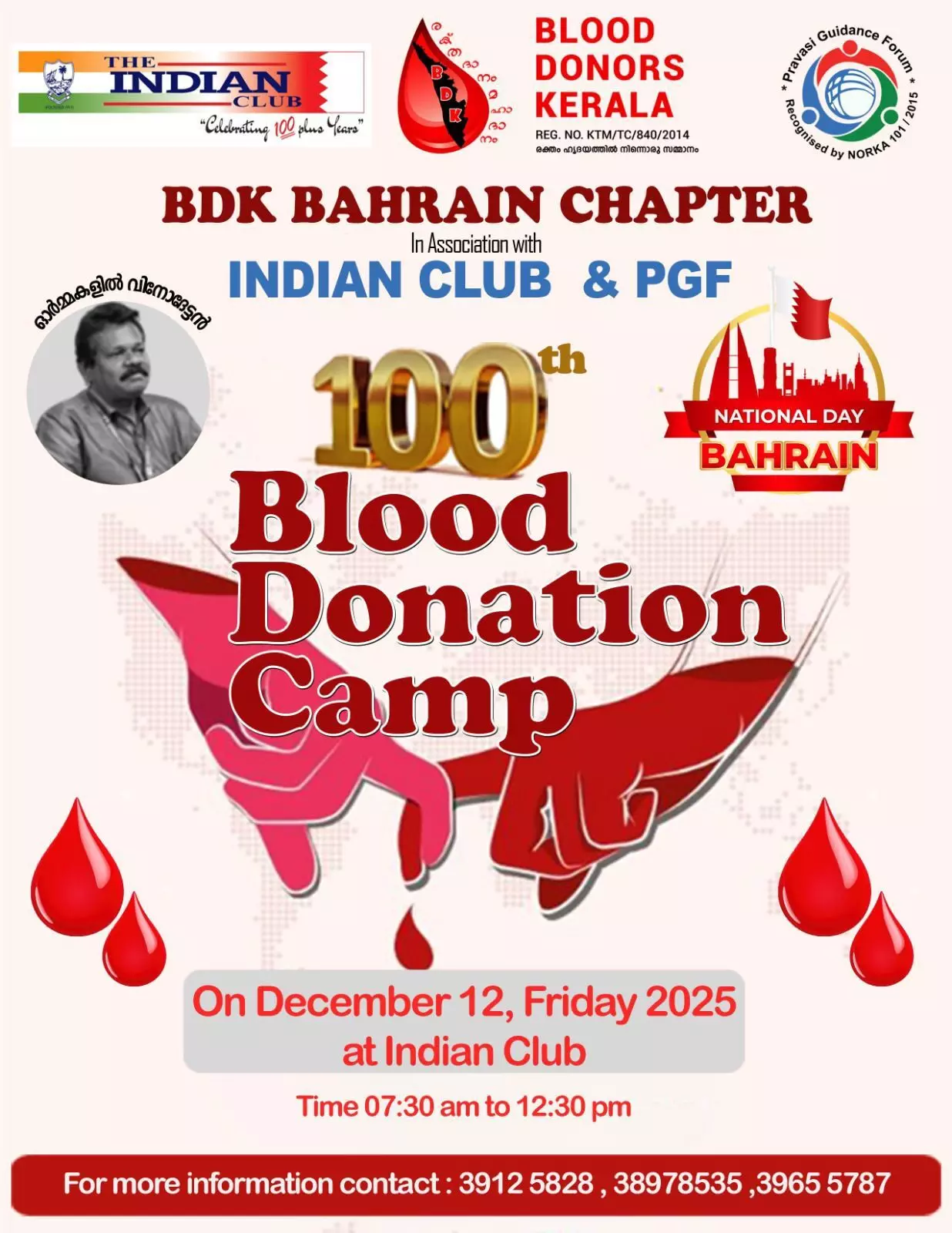 ബിഡികെ 100 മത് രക്തദാന ക്യാമ്പ് വെള്ളിയാഴ്ച ഇന്ത്യന് ക്ലബ്ബില്