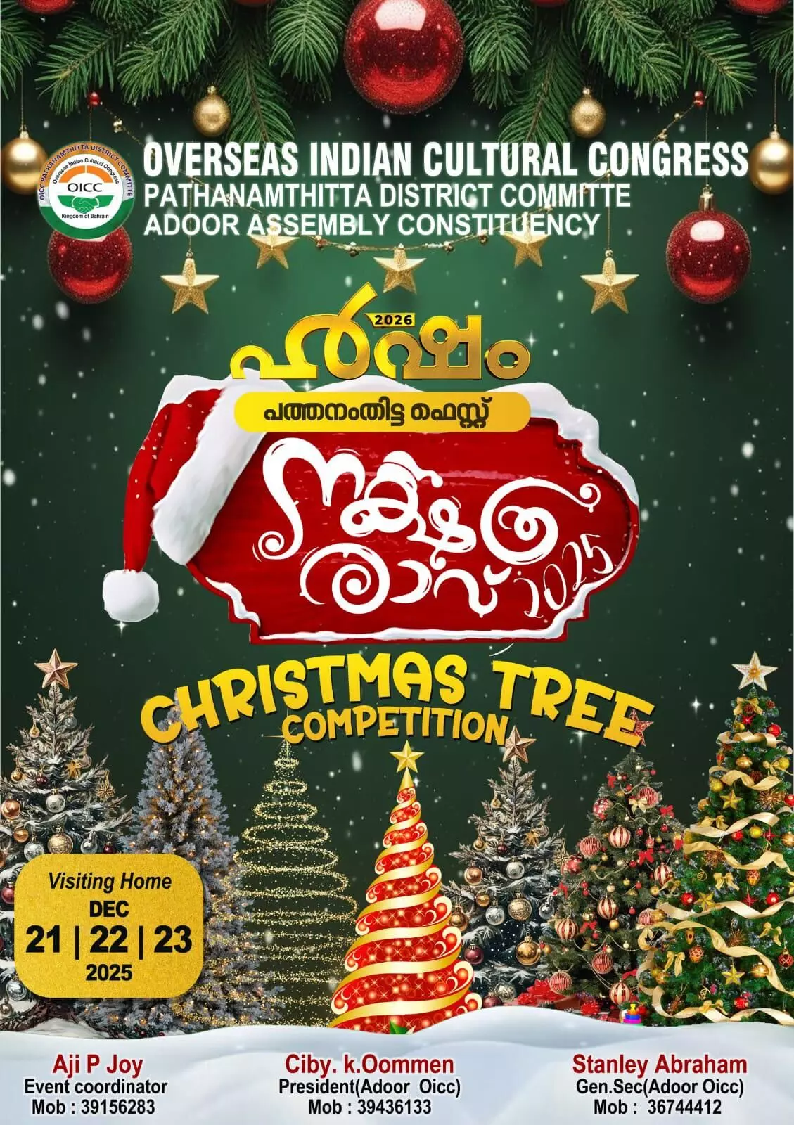 മനാമ: ഒഐസിസി പത്തനംതിട്ട ഫെസ്റ്റ് ' ഹര്ഷം 2026' ഭാഗമായി അടൂര് നിയോജകമണ്ഡലം കമ്മിറ്റി നടത്തുന്ന ട്രീ കോമ്പറ്റിഷന് 21, 22, 23 തീയതികളില് നടക്കും രജിസ്റ്റര് ചെയ്ത ആളുകളുടെ വീടുകളില് വിധി കര്ത്താകള് എത്തി ട്രീ കണ്ട് വിലയിരുത്തി മാര്ക്കിടും. വിജയികള്ക്ക് ആകര്ഷമായ സമ്മാനങ്ങള് പത്തനംതിട്ട ഫെസ്റ്റ് നോട് അനുബന്ധിച്ച് നല്കും.