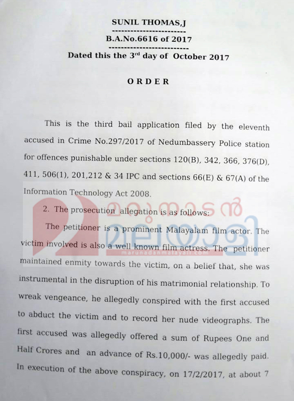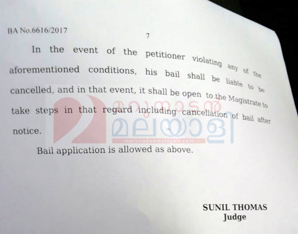 നടിയെ വാക്കുകൾ കൊണ്ടോ പ്രവൃത്തി കൊണ്ടോ അപമാനിക്കരുത്; മാധ്യമങ്ങളിലൂടെയോ സോഷ്യമീഡിയ വഴിയോ പരാമർശം നടത്തിയാൽ ജാമ്യം റദ്ദാവും; ദിലീപിന് മുൻ ക്രിമിനൽ പശ്ചാത്തലമില്ലെന്നുമുള്ള വാദങ്ങൾ നിർണായകമായി; കേസന്വേഷണം തീരാനായ ഘട്ടത്തിലും കസ്റ്റഡിയിൽ വയ്ക്കുന്നത് ഉചിതമല്ലെന്ന് നിരീക്ഷിച്ച് താരരാജാവിന് ജാമ്യം നൽകിയ കോടതിവിധി പകർപ്പ്