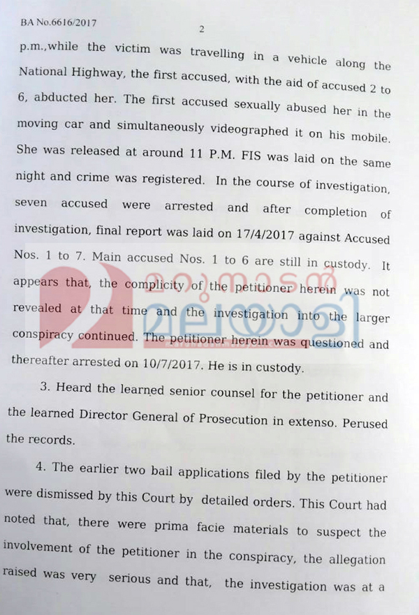 കൊച്ചി: നടിയെ ആക്രമിച്ച സംഭവത്തിൽ നേരിട്ട് പങ്കെടുത്തില്ലെന്ന പ്രൊസിക്യൂഷൻ വാദവും മുമ്പ് ജാമ്യാപേക്ഷ സമർപ്പിച്ച കാലത്തേതിൽ നിന്നും അന്വേഷണത്തിൽ പുരോഗതി ഉണ്ടായെന്ന നിരീക്ഷണവും ദിലീപിന് ജാമ്യം ലഭിക്കുന്നതിൽ നിർണായകമായെന്ന് ജാമ്യം അനുവദിച്ചുള്ള കോടതി ഉത്തരവിൽ നിന്ന് വ്യക്തമാകുന്നു. ഏഴുപേജുള്ള ഉത്തരവാണ് ദിലീപിന് ജാമ്യം അനുവദിച്ചുകൊണ്ട് ജസ്റ്റിസ് സുനിൽ തോമസ് പുറപ്പെടുവിച്ചത്. മാത്രമല്ല, ദിലീപിന് മുൻകാല ക്രിമിനൽ പശ്ചാത്തലമില്ലെന്നതുകൂടി കോടതി പരിഗണിച്ചുവെന്നതും ശ്രദ്ധേയമാണ്.