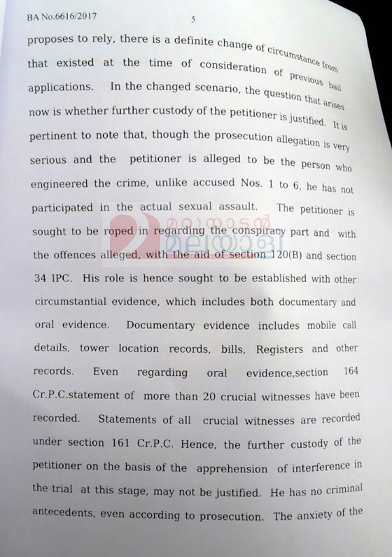ഗൂഢാലോചനക്കേസുമായി മാത്രമാണ് പ്രതിക്ക് ബന്ധം. മറ്റ് സാഹചര്യത്തെളിവുകളിലൂടെയും മൊഴികളിലൂടെയുമാണ് അത് തെളിയിക്കപ്പെടേണ്ടത്. മൊബൈൽ വിവരങ്ങൾ, ടവർ ലൊക്കേഷൻ തുടങ്ങിയ കാര്യങ്ങളുൾപ്പെടെ ശേഖരിച്ചിട്ടുണ്ടെന്നതും നിർണായകമായ ഇരുപതോളം സാക്ഷികളുടെ മൊഴികൾ രേഖപ്പെടുത്തിക്കഴിഞ്ഞുവന്നതും മുൻനിർത്തിയാണ് കോടതി ജാമ്യം നൽകുന്നത്. അതിനാൽ തന്നെ തുടർന്നും പ്രതിയെ കസ്റ്റഡിയിൽ വയ്ക്കേണ്ടതില്ലെന്നുകൂടി നിരീക്ഷിച്ചുകൊണ്ടാണ് കോടതി ഉപാധികളോടെ ദിലീപിന് ജാമ്യം അനുവദിച്ചത്. കേസന്വേഷണം അന്തിമ ഘട്ടത്തിലാണെന്നതിനാൽ തന്നെ ഇനിയും കസ്റ്റഡിയിൽ പ്രതിയെ വയ്ക്കേണ്ടതില്ലെന്നും കോടതി വ്യക്തമാക്കുന്നുണ്ട്.
