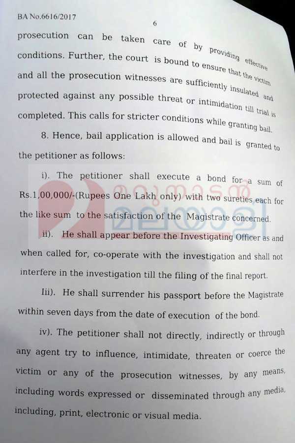 അതേസമയം, കർശന ജാമ്യ വ്യവസ്ഥകൾ പ്രഖ്യാപിച്ച കോടതി ആക്രമണത്തിന് ഇരയായ നടിക്കെതിരെ വാക്കുകൊണ്ടോ പ്രവൃത്തികൊണ്ടോ എന്തെങ്കിലും നീക്കമുണ്ടായാൽ ജാമ്യം റദ്ദാക്കുമെന്നും വ്യക്തമാക്കിയിട്ടുണ്ട്. മാത്രമല്ല, പ്രിന്റ്, ഇലക്ട്രോണിക്, വിഷ്വൽ മീഡിയകൾ വഴി ഒരു പരാമർശവും ഉണ്ടാവരുതെന്നും ഊന്നിപ്പറഞ്ഞിട്ടുമുണ്ട്.