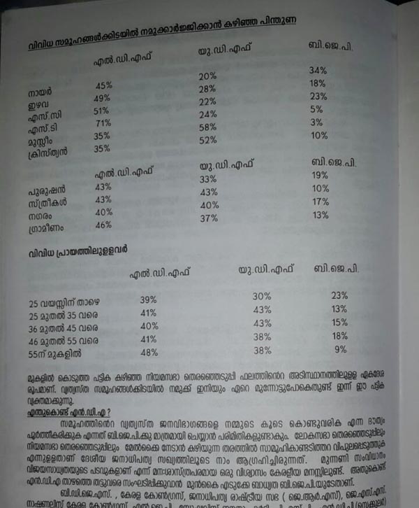 വിവിധ സമുദായങ്ങൾക്കിടയിൽ പാർട്ടിക്ക് ആർജിക്കാൻ കഴിഞ്ഞ പിന്തുണ അക്കമിട്ട് നിരത്തിയിരിക്കുകയാണ് പഠനരേഖയിൽ. ഒപ്പം വലതിനും ഇടതിനും കിട്ടുന്ന പിന്തുണയും പരാമർശിച്ചിരിക്കുന്നു. കണക്ക് പ്രകാരം നായർ സമുദായത്തിൽ എൽഡിഎഫിന് 45ഉം യുഡിഎഫിന് 20 ഉം ബിജെപിക്ക് 30ഉം ശതമാനം പിന്തുണയാണുള്ളത്. ഈഴവ സമുദായത്തിൽ അത് യഥാക്രമം 49, 28, 18 ശതമാനം വീതമാണ്. പട്ടികജാതിയിൽ 51,22,23, വർഗത്തിൽ 71,24,5, മുസ്ലിം സമുദായത്തിൽ 35,58,3, ക്രൈസ്തവ സമുദായത്തിൽ 35,52,10 ശതമാനം വീതമാണ് ഓരോ മുന്നണിക്കുമുള്ള പിന്തുണ.
