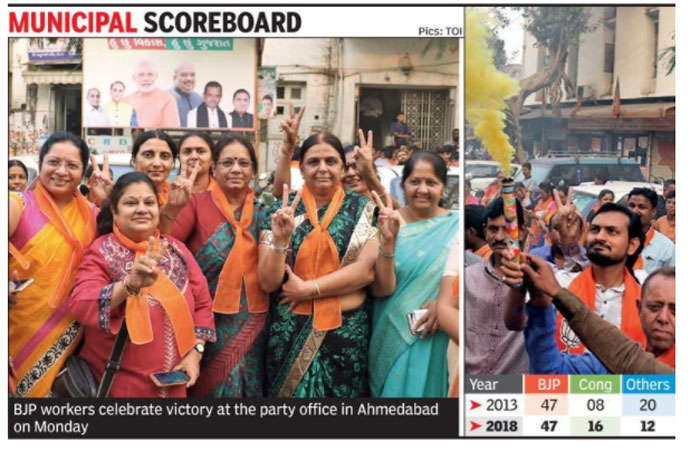 99 സീറ്റാണ് ബിജെപിക്ക് ലഭിച്ചത്. കോൺഗ്രസിന് 78ഉം. അതുകൊണ്ട് തന്നെ മുൻസിപ്പൽ തിരഞ്ഞെടുപ്പിൽ ബിജെപിക്ക് വലിയ തിരിച്ചടി പ്രവചിച്ചിരുന്നു. ഇതിനിടെയിലും 62 ശതമാനം സീറ്റുകളിലും ജയിക്കാൻ ബിജെപിക്ക് കഴിഞ്ഞു. അതുകൊണ്ട് തന്നെ നേരിയ മുന്നേറ്റം മാത്രമാണ് കോൺഗ്രസിന് ലഭിച്ചത്. നിയമസഭാ തെരഞ്ഞെടുപ്പിലെ കണക്ക് അനുസരിച്ചാണെങ്കിൽ കോൺഗ്രസിന് 30 മുനിസിപ്പാലിറ്റി വരെ കിട്ടണമായിരുന്നു. ദക്ഷിണ ഗുജറാത്തിലും മറ്റും ബിജെപി അതിശക്തമായി തിരിച്ചുവന്നു. പ്രധാനമന്ത്രി മോദിയുടെ ജന്മനാട്ടിലും ബിജെപി വീണ്ടും കരുത്തു കാട്ടി. നിയമസഭാ തെരഞ്ഞെടുപ്പിൽ ഇവിടെ ബിജെപി പിന്നോക്കം പോയിരുന്നു. വടനഗറിൽ 28ൽ 27 സീറ്റിലും ബിജെപി ജയിച്ചു.