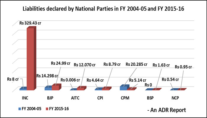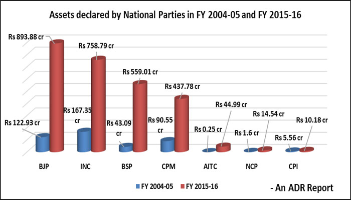 ബിജെപിയുടെ ആസ്തിയിൽ 700 ശതമാനം വർദ്ധന രേഖപ്പെടുത്തി.കോൺഗ്രസിനാകട്ടെ 169 ശതമാനവും. 2004-05ൽ ബിജെപിയുടെ ആസ്തിമൂല്യം 123 കോടിയായിരുന്നു. എന്നാൽ ഇവ രണ്ടുമല്ല ആസ്തി വർധനയുടെ ശതമാനക്കണക്കിൽ മുൻപിലുള്ളത്. തൃണമൂൽ കോൺഗ്രസിന് ഇക്കാലത്തിനിടെ 13,447 ശതമാനവും ബിഎസ്പിക്ക് 1,194 ശതമാനവുമാണ് ആസ്തി കൂടിയത്. 2004-05ൽ ദേശീയ പാർട്ടികളുടെ ആസ്തികളുടെ ശരാശരി 61.62 കോടി രൂപയായിരുന്നു. 2015-16ൽ ഇത് 388.45 കോടിയായി കുതിച്ചുയർന്നു.