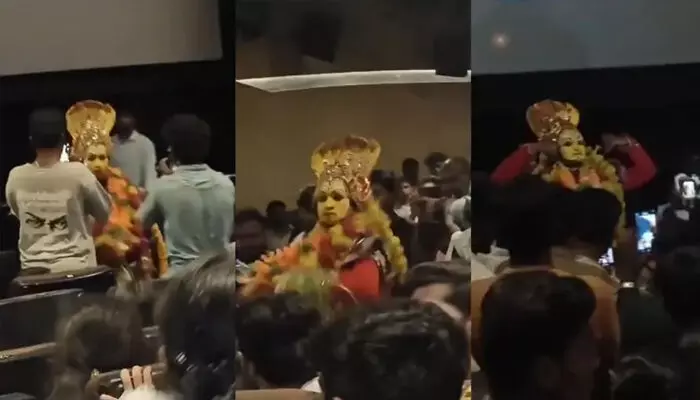കാന്താര പ്രദര്ശനം അവസാനിച്ചതിന് പിന്നാലെ ആളുകളിലേക്ക് ഓടിക്കയറി പഞ്ചുരു തെയ്യം; വരാഹ രൂപം പാട്ടിന് ചുവട്വെച്ചു; ഞെട്ടി കാണികള്; വീഡിയോ വൈറല്