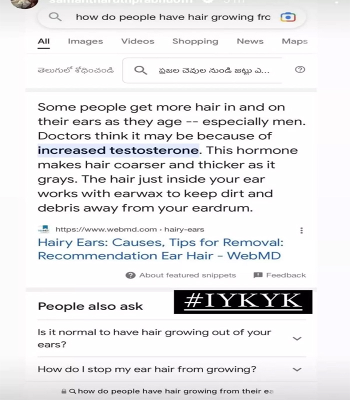 ചെവിയിൽ മുടി വളരുന്നത് എങ്ങനെയാണ് എന്ന് ഗൂഗിളിൽ സെർച്ച് ചെയ്തതിന്റെ സ്ക്രീൻ ഷോർട്ടാണ് സാമന്ത പങ്കുവെച്ചിരിക്കുന്നത്.