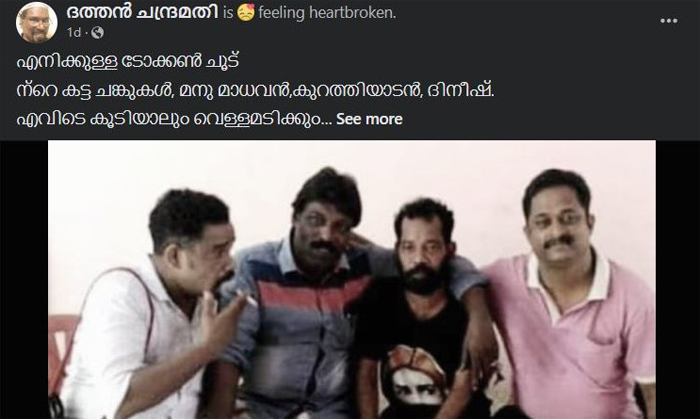 അടിയുണ്ടാക്കും. പൗരസ്വാതന്ത്ര്യം , സ്ത്രീ, ദളിത് ഭരണകൂടം. വലിയ അഭിപ്രായ വ്യത്യാസങ്ങൾ ഉണ്ടായിരുന്നു ഞങ്ങൾക്കിടയിൽ.എന്നാലും വീട്ടിൽ എത്തിയോ എന്നു വിളിച്ചു ചോദിച്ചോട്ടെ കിടന്നുറങ്ങൂ. മനു മാധവൻ ഒന്നും പറയാതെ പോയി 2019 സെപ്റ്റംബറിൽ , കുറത്തി പുറകെ ഞെട്ടിച്ചു കൊണ്ട് 2021 ജനുവരിയിൽ അവനൊപ്പം കൂടി. ഇന്നലെ അവനും.......... ബാക്കി ഞാൻ മാത്രം, മൂന്നുപേരും അവർ ഒന്നായി എന്നേ മാത്രം പുറന്തള്ളി.എനിക്കുള്ള നറുക്ക്.............നാളെ നാളെ എന്നൊരു സൈക്കിൾ അനൗസ്മെന്റ് വാഹനം തലയിൽ പെരുക്കുന്നു.''- ഇങ്ങനെയാണ് ദത്തൻ പോസ്റ്റിട്ടിരിക്കുന്നത്.