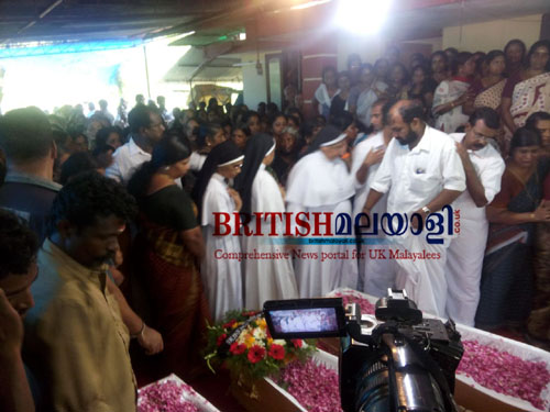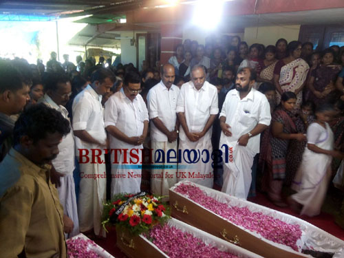 രതീഷിന്റെ മൃതദേഹം ഏറ്റുവാങ്ങിയത് സഹോദരൻ ദേവദാസാണ്. രതീഷിന്റെ മൃതദേഹം ഷൊർണൂർ ശാന്തിതീരത്തെ ശ്മശാനത്തിൽ വളരെ അടുത്ത ബന്ധുക്കളുടെയും കൂട്ടുകാരുടെയും സാന്നിദ്ധ്യത്തിൽ ഉച്ചയ്ക്കു മുമ്പു തന്നെ അടക്കുകയായിരുന്നു. ഇതിന് മുമ്പ് രതീഷിന്റെ പുല്ലറക്കാട്ട് വീട്ടിൽ അന്ത്യകർമങ്ങളും നിർവ്വഹിച്ചിരുന്നു. ഷിജിയുടെയും മക്കളുടെയും മൃതദേഹം ഷിജിയുടെ കോട്ടുവാലവീട്ടിൽ എത്തിയപ്പോൾ വികാര നിർഭരമായ രംഗങ്ങൾക്കാണ് നാട്ടുകാർ സാക്ഷികളായത്. ഒന്നര മണിക്കൂറോളം വീട്ടിൽ മൃതദേഹങ്ങൾ പൊതുദർശനത്തിന് വച്ചു. നേഹയെയും നിയയെയും ജീവനായിരുന്നു മുത്തച്ഛൻ പത്മനാഭന്. പേരകുട്ടികളെ ഒരു നോക്ക് കാണാൻ പോലും ആവതില്ലാതെയാണ് പത്ഭനാഭൻ വീടിനുള്ളിൽ തളർന്നുകിടന്നത്. എംബസ്സി ഉദ്യോഗസ്ഥരും മറ്റും നൂറോളം പൊലീസുകാരുടെ അകമ്പടിയോടെയാണ് ഷിജിയുടെ വീട്ടിലേക്ക് പോയത്. മൃതദേഹവുമായി എത്തിയ ഹരിദാസിനും പൊലീസ് അകമ്പടി ഉണ്ടായിരുന്നു.