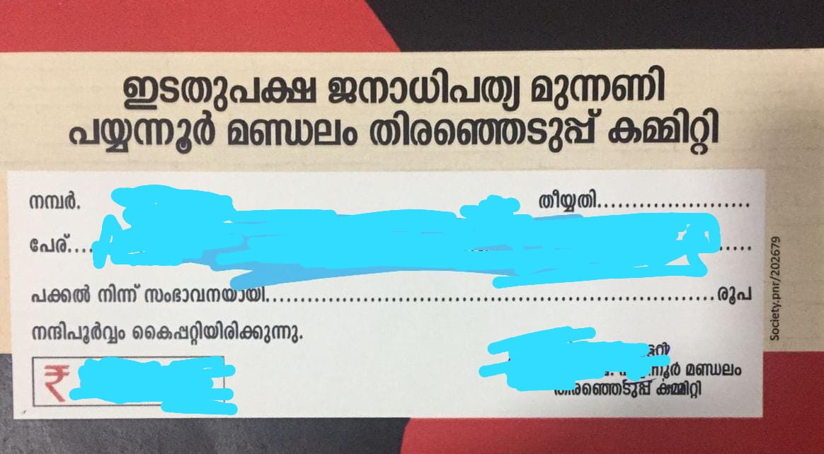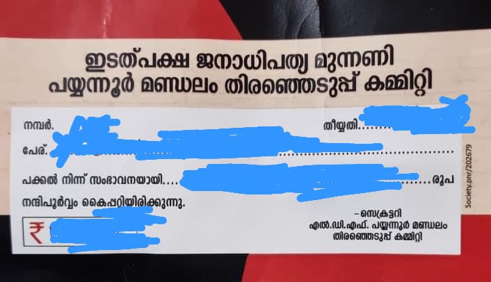 രണ്ടു രസീത് ബുക്കുകളും സ്വകാര്യ പ്രസിൽ നിന്നും അച്ചടിക്കുകയും സഹകരണ പ്രസെന്ന് പേരു വ്യാജമായി ചേർക്കുകയുമായിരുന്നു എന്നാൽ ഇതിനിടെയിൽ ഒരു അക്കിടികൂടി പറ്റി. ഇടത് പക്ഷ ജനാധിപത്യ മുന്നണിയെന്നാണ് ഒറിജിനലിൽ ചേർത്തതെങ്കിൽ ഇടതുപക്ഷ ജനാധിപത്യ മുന്നണിയെന്നാണ് വ്യാജനിൽ അച്ചടിച്ചിട്ടുള്ളത്. തെരഞ്ഞെടുപ്പ് ഫണ്ടിൽ നിന്നും 60 ലക്ഷം രൂപയുടെ വെട്ടിപ്പ് നടന്നതായാണ് ആരോപണമുയർന്നത്.
