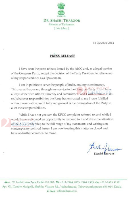 മോദിസ്തുതി പാടിയ ശശി തരൂരിനെ എഐസിസിയും കൈവിട്ടു; കെപിസിസിയുടെ ആവശ്യപ്രകാരം തിരുവനന്തപുരം എംപിക്കെതിരെ നടപടി; കോൺഗ്രസ് വക്താവ് സ്ഥാനം തെറിച്ചു; തീരുമാനം ഉചിതമെന്ന് വി എം സുധീരൻ; അമർഷം പറയാതെ പറഞ്ഞ് തരൂർ