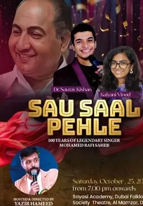 ദുബായ്: അനശ്വര ഗായകന് മുഹമ്മദ് റാഫിയുടെ നൂറാം ജന്മ വാര്ഷികാഘോഷങ്ങളുടെ ഭാഗമായിഇവന് ടൈഡ്സിന്റെ ആഭിമുഖ്യത്തില് ഒക്ടോബര് ഇരുപത്തഞ്ചിന് വൈകിട്ട് ഏഴ് മണിക്ക് ദുബായ്മംസാറിലെ സയാസി അക്കാദമി ഫോള്ക് ലോര് തിയറ്ററില് വെച്ച് 'സൗ സാല് പെഹലെ'(നൂറു വര്ഷങ്ങള്ക്കു മുമ്പേ) എന്ന ശീര്ഷകത്തില് സംഗീത സമര്പ്പണ പരിപാടി നടത്തുന്നു.