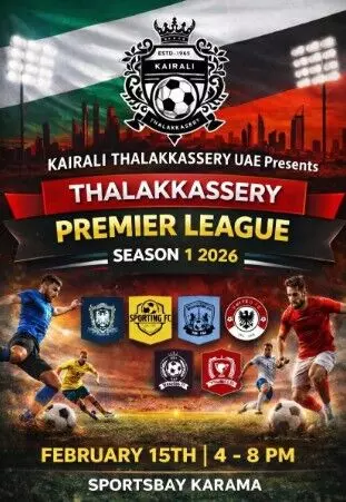കൈരളി തലക്കശ്ശേരി യുഎഇ സംഘടിപ്പിക്കുന്നതലക്കശ്ശേരി പ്രീമിയര് ലീഗ് സീസണ് 1ദുബായ് കറാമയില് 2026 ഫെബ്രുവരി 15-ന് ഞായറാഴ്ച 4 മണിക്ക് ആരംഭിക്കുമെന്ന് കെ.സി അബൂബക്കര് അറിയിച്ചു.