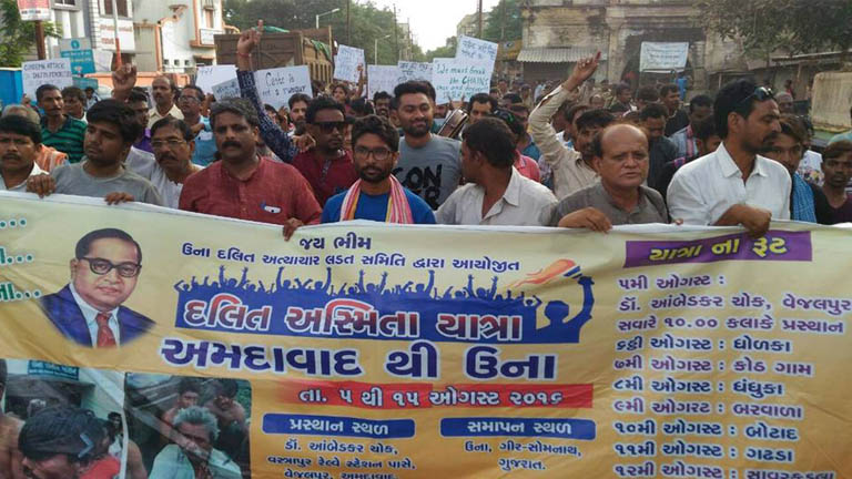 സംഘപരിവാർ ഭീകരതക്കെതിരെ ഗുജറാത്തിലെ ദളിതർ പത്ത് ദിവസമായി തുടരുന്ന അസ്മിത(അഭിമാന)മാർച്ചിന്റെ ഭാഗമായി സ്വാതന്ത്ര്യ ദിനത്തിൽ തോട്ടിപ്പണിയിൽ നിന്നും സ്വാതന്ത്ര്യം പ്രഖ്യാപിച്ച് ദേശീയ പതാക ഉയർത്തി. പട്ടേൽ പ്രക്ഷോഭത്തിന്റെ ചൂടറിഞ്ഞ ബിജെപിക്ക് തങ്ങളുടെ കാൽച്ചുവട്ടിലെ മണ്ണൊലിച്ചു പോകുന്നുവെന്ന തിരിച്ചറിവ് നൽകുന്നാണ് ഉനയിലെ ദളിത് പ്രക്ഷോഭവും. പശുവിന്റെ തോലുരിച്ചതിന്റെ പേരിൽ ദളിത് യുവാക്കളെ മൃതപ്രായരാക്കിയതിനെതിരെ തിളച്ചുമറിയുന്ന രോഷവുമായി എത്തിയ മാർച്ചിനെ പതിനായിരങ്ങളാണ് ഉനയിലേക്ക് വരവേറ്റത്. നാലിന് അഹമ്മദാബാദിൽ നിന്നാണ് ജിഗ്നേഷ് മേവാനിയുടെ നേതൃത്വത്തിൽ മാർച്ച് ആരംഭിച്ചത്.