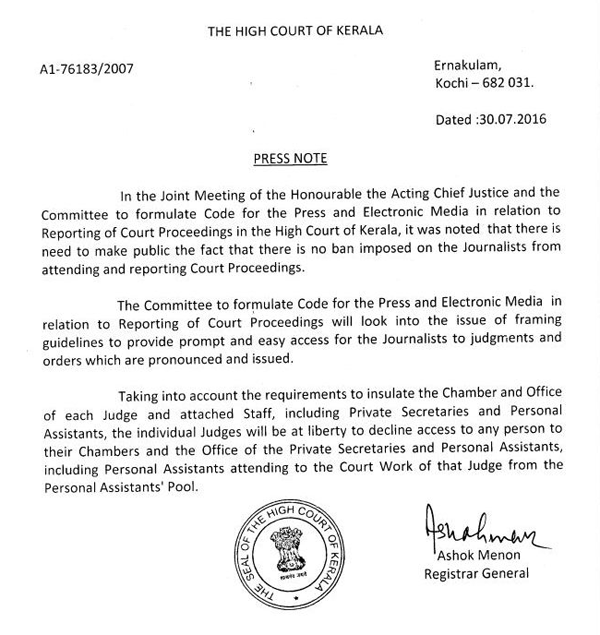 ഹൈക്കോടതിയിൽ മാദ്ധ്യമപ്രവർത്തകർക്ക് വിലക്ക് ഏർപ്പെടുത്തിയിട്ടില്ല; ജഡ്ജിമാരുടെ ചേംബറിൽ എത്തി റിപ്പോർട്ട് എടുക്കുന്നതിൽ തീരുമാനം ജഡ്ജിമാർക്ക് എടുക്കാമെന്നും രജിസ്ട്രാർ; മാദ്ധ്യമ-അഭിഭാഷക തർക്കം തീരുന്നു