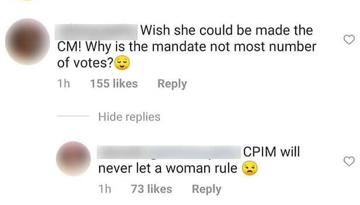 സിപിഎം സ്ത്രീകൾക്ക് ഒരിക്കലും അധികാരം നൽകില്ല എന്ന ആ സ്റ്റേറ്റ്മെന്റാണ് കൂടുതൽ കൗതുകകരം. അതും മുൻ ആരോഗ്യമന്ത്രി ഷൈലജ ടീച്ചറെ തന്നെ മെൻഷൻ ചെയ്യുന്ന കമന്റിൽ.(ലേശം...) കണക്കുകളെടുത്താൽ തന്നെയും ഏറ്റവും കൂടുതൽ സ്ത്രീനേതാക്കൾ അധികാരകസേരയിൽ ഇരുന്ന ചരിത്രമുള്ള പാർട്ടിയാണ് സിപിഎം. ലേശമെങ്കിലും ചരിത്ര-രാഷ്ട്രീയബോധം ഉണ്ടാവുന്നത് ഗുണമേചെയ്യൂ.'