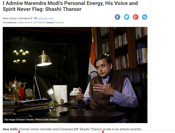 പ്രധാനമന്ത്രിയുടെ എനർജി ലെവലും, നിരന്തരമുള്ള യാത്രകളിൽ അദ്ദേഹം പുലർത്തുന്ന അർപ്പണബോധവും കാര്യങ്ങൾക്ക് സമയക്രമം ശ്രിഷ്ടിക്കുന്നതും അദ്ദേഹത്തിന്റെ പ്രസംഗവും എല്ലാം തന്നെ കോട്ടം തട്ടാതെ തുടരുന്നു. രാഷ്ട്രീയമായി എതിർപ്പുള്ളവർ പോലും അദ്ദേഹത്തിന്റെ ഈ പറഞ്ഞ ഗുണങ്ങൾ അംഗീകരിക്കും. താനും അംഗീകരിക്കുന്നുവെന്നാണ് ശശി തരൂർ ഒരു ദേശീയ മാദ്ധ്യമത്തിന് നൽകിയ അഭിമുഖത്തിൽ പറഞ്ഞത്. മുൻപും ശശി തരൂർ പ്രധാനമന്ത്രിയെ പുകഴ്ത്തി രംഗത്ത് വന്നതിനെ സോണിയ ഗാന്ധി ഉൾപ്പടെയുള്ള ദേശീയ നേതാക്കൾ വിമർശിച്ചിരുന്നു. മോദിയെ പുകഴ്ത്തുന്ന നിലപാട് ശശി തരൂർ പുന പരിശോധിക്കണമെന്ന് കോൺഗ്രസിന്റെ സംസ്ഥാന നേതൃത്വവും നേരത്തേ തന്നെ ആവശ്യപ്പെട്ടിരുന്നു.