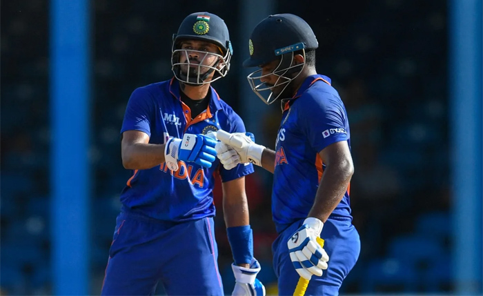 വിൻഡീസ് ഉയർത്തിയ 312 റൺസ് ലക്ഷ്യമിട്ടിറങ്ങിയ ഇന്ത്യയുടെ തുടക്കം ശുഭകരമായിരുന്നില്ല. 79 റൺസിനിടെ ധവാനും ശുഭ്മാൻ ഗില്ലും സൂര്യകുമാർ യാദവും മടങ്ങിയതോടെ ഇന്ത്യ പ്രതിരോധത്തിലായി. പിന്നീട് ഒത്തുചേർന്ന ശ്രേയസ് അയ്യർ-സഞ്ജു സാംസൺ സഖ്യമാണ് ഇന്ത്യയെ പതിയെ മത്സരത്തിലേക്ക് തിരിച്ചെത്തിച്ചത്.ഇരുവരും ചേർന്ന് നാലാം വിക്കറ്റിൽ 99 റൺസിന്റെ കൂട്ടുകെട്ടുണ്ടാക്കി. ശ്രേയസ് പുറത്തായതിന് പിന്നാലെ സഞ്ജു റണ്ണൗട്ടായി മടങ്ങിയോതോടെ വിൻഡീസ് പിടിമുറുക്കി.