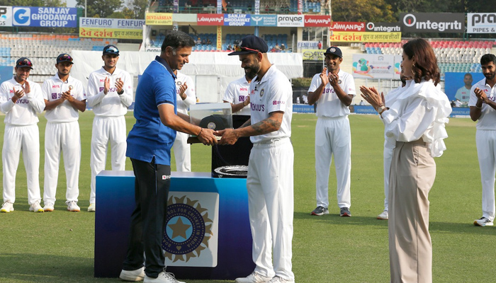 ടോസിന് ശേഷമാണ് പരിശീലകരും സഹതാരങ്ങളും കോലിയെ ആദരിക്കുന്ന ചടങ്ങ് നടത്തിയത്. കോലിയുടെ ഭാര്യ അനുഷ്ക ശർമയും ഗ്രൗണ്ടിലുണ്ടായിരുന്നു. മനോഹരമായ പ്രസംഗത്തിലൂടെ കോലിയെ അഭിനന്ദിച്ചാണ് ദ്രാവിഡ് ക്യാപ് കൈമാറിയത്. ഇതിന് അതേരീതിയിൽ കോലി മറുപടിയും നൽകി. അതിനുശേഷം അനുഷ്കയെ ചുംബിച്ച് കോലി സന്തോഷം പ്രകടിപ്പിക്കുകയും ചെയ്തിരുന്നു.