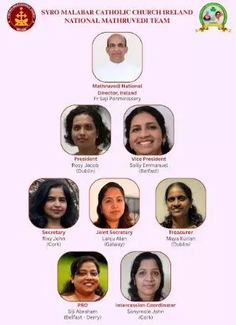 ഡബ്ലിന്: അയര്ലണ്ടിലെ സീറോ മലബാര് സഭയുടെ നാഷണല് മാതൃവേദിയുടെ പുതിയ ഭാരവാഹികള് ചുമതലയേറ്റെടുത്തു. ഒക്ടോബര് 1-ാം തീയതി നാഷണല് ഡയറക്ടര് ഫാ. സജി പൊന്മിനിശ്ശേരിയുടെ അധ്യക്ഷതയില് ചേര്ന്ന യോഗത്തിലാണ് അടുത്ത രണ്ട് വര്ഷത്തേക്ക് ഭാരവാഹികളെ തിരഞ്ഞെടുത്തത്.