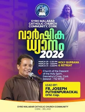 കോര്‍ക്ക്: കോര്‍ക്ക് സിറോ-മലബാര്‍ കത്തോലിക്കാ കമ്മ്യൂണിറ്റിയുടെ ആഭിമുഖ്യത്തില്‍ ഈ വര്‍ഷത്തെ നോമ്പുകാല വാര്‍ഷിക ധ്യാനം മാര്‍ച്ച് 29-ന് ഓശാന ഞായറാഴ്ച ആരംഭിക്കും. Dennhy's Cross ദേവാലയത്തില്‍ ഉച്ചകഴിഞ്ഞ് 2.30ന് ഓശാന തിരുക്കര്‍മ്മങ്ങളോടെയാണ് ധ്യാനപരിപാടികള്‍ക്ക് തുടക്കമാകുന്നത്. പ്രശസ്ത ധ്യാനഗുരുവായ റവ. ഫാ. ജോസഫ് പുത്തന്‍പുരക്കല്‍ OFM Cap ധ്യാനശുശ്രൂഷകള്‍ക്ക് നേതൃത്വം നല്‍കും.